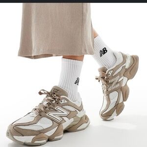 Comfortable New Balance shoes in taupe and white. Ideal for everyday activities.