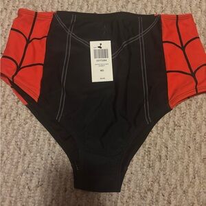 No villains, just vibes! Suit up for a heroic day at the beach in this halter swim top! Inspired by Miles Morales's costume, this top features red and black color-blocking with a red spider logo printed on the chest and spiderweb designs on the sides. Comes with removable padding. Pair it with the matching bottoms for the ultimate web-slinging beach day!