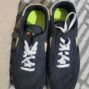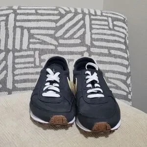 Stylish Men Nike sneakers. Black upper with Cream accents. Comfortable and trendy design.