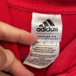 Youth L (18-20) Adidas hooded sweatshirt red/black graphic Kangaroo pouch/pocket 20”pit to pit, 25” shoulder to hem.