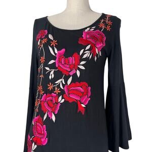Vintage Collection dress in women’s size XS. Black stretch knit with vibrant pink/red floral embroidery + hand beading and dramatic bell sleeves. Scoop neckline and easy, slightly A-line silhouette—perfect for boho events, concerts, holiday parties, or boutique western vibes.