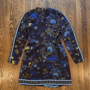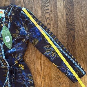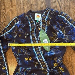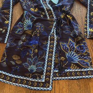 BNWT-Never worn Farm Rio wrap mini dress with floral pattern. Beautiful blues, purple & golds! Long sleeves, beaded tie ends.