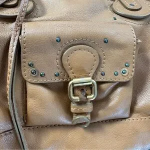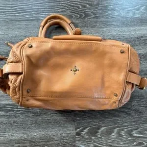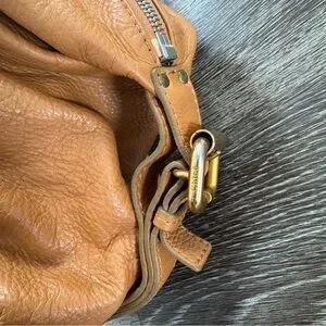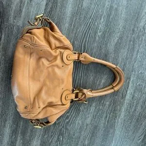 Chloe shoulder bag in rich tan leather. Features dual handles and front buckle detail. Stylish and versatile.