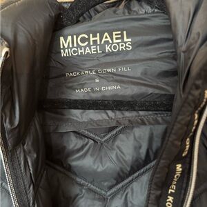 Chic black puffer jacket by Michael Kors. Features a sleek quilted design. Ideal for cold weather.