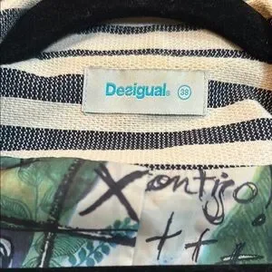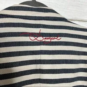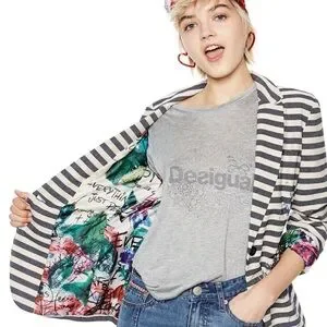 Elevate your style with this chic striped blazer featuring unique artistic accents. Perfect for adding a touch of sophistication to any outfit.