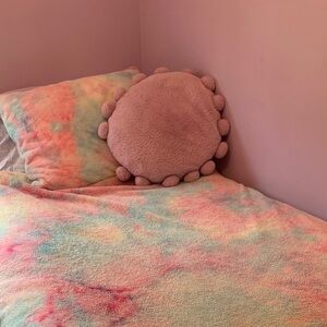 Vibrant and plush tie-dye set. Includes a cozy blanket and matching pillow. Perfect for brightening up any room. Twin size and soft. One stain on the corner. Otherwise, perfect for any tie dye Ugg fan. Comes with Sham and Ugg decorative pillow, which is missing a small ball accent. Lovely pastel colors and goes with many room colors.