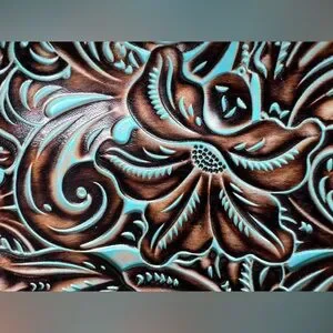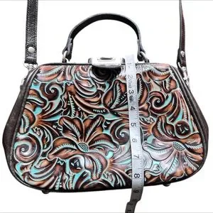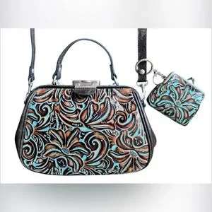 Turquoise Framed Gracchi Tooled Brntl Leather Crossbody/ Marching Coin Purse that hooks to bag
