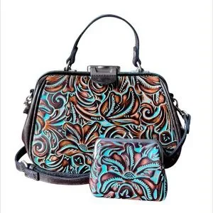 Patricia Nash Turquoise Framed Gracchi Tooled Burnt Leather Crossbody Set