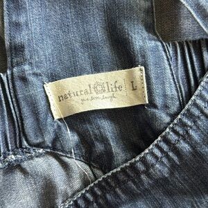 Chic denim mini dress. Features front pockets. Adjustable straps for perfect fit.