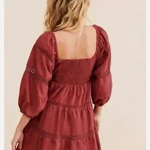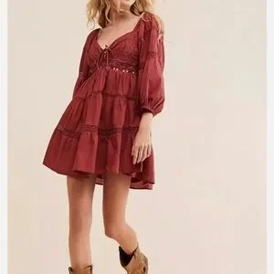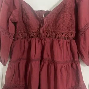 Elegant deep red dress with lace details. Features puff sleeves and a flowy silhouette. Perfect for any occasion.