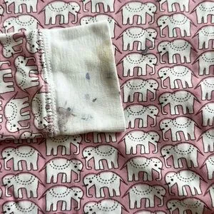 ROLLER RABBIT- Cozy and cute, these pink elephant print pajamas are perfect for bedtime. Soft fabric ensures comfort all night long. One small stain on sleeve and little blue dot on the top. Otherwise great condition!