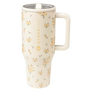 Stylish insulated tumbler with floral pattern. Cream background with yellow accents. Durable and elegant design.
