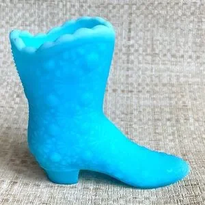 FINAL PRICE. Vintage Milk Glass Boot in rare Blue “Custard” glass—the name for the satin finish, opaque milk glass). By Fenton, circa 1960s. Embossed Daisy & Button pattern throughout. Scalloped edging. Darling decorative item as well as storage for pens, hair accessories, safety pins, and so on.