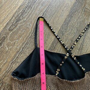 -Shimmery metallic slightly throughout body, spaghetti straps not adjustable, measurements in photos