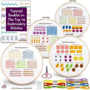 Included Components: 1x Embroidery Hoop (8 Inches), 1x Instruction Booklet, 3x Embroidery Fabrics With Patterns, 5x Embroidery Needles, 7x Color Threads (8 Meters For Each)