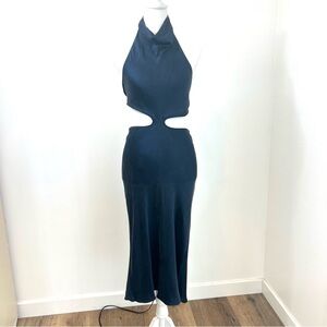 Elegant navy dress with stylish cutouts. Perfect for evening wear.