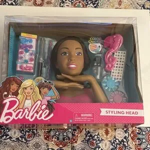 Barbie styling head with vibrant pink lips and blue eyeshadow. Includes colorful accessories for creative play.