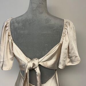 -style midi cowl neck open back with tie invisible back zipper bell sleeves asymmetrical hem
