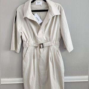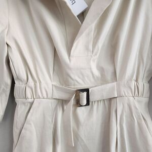 The SAM dress has sportswear inspiration. The short dress has a straight style that's gathered at the waist with a belt and elastic at back. The shirt collar is enhanced with a button placket. You'll note the slant pockets and contrasting grosgrain ribbon along the sleeves. A dress with easy chic that's easy to wear and cut in a beautiful fabric.