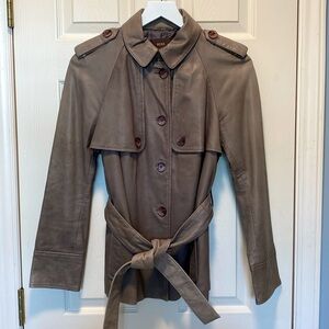 Butter soft taupe leather jacket from Reiss. Has all the features of a classic trench coat, but in leather and a shorter length. Timeless piece, perfect for cooler weather. Approximate measurements: bust 18“ armpit to armpit laying flat, length 26“ from shoulder to hem, bottom opening 20” laying flat. There are a few marks on the leather, examples as pictured, that I have not treated. Otherwise, it’s in fabulous condition! Spare buttons inside care tag.