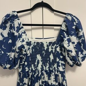 Chic navy and white midi dress with puff sleeves. Features a ruched bodice and flowing skirt.