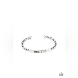 Twisted silver bars attach to a shiny silver plate stamped in the word, "BELIEVE," creating an inspiring cuff around the wrist.