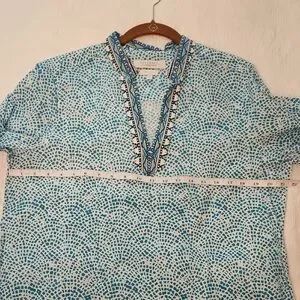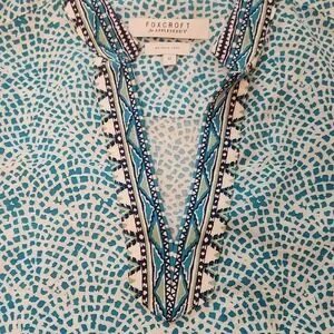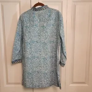 Stylish tunic with intricate turquoise patterns. Features a comfortable fit, v-neck, side slits and elegant design. Perfect for casual or beach/resort wear.