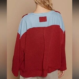 New POL Exposed Seam Star Denim Patch Round Neckline Relaxed Fit Sweater Red