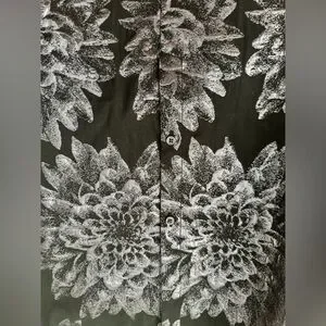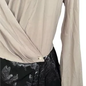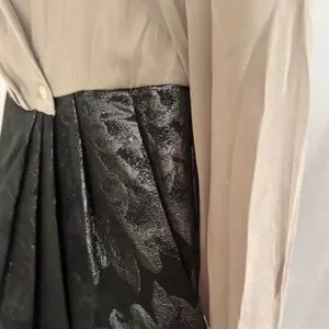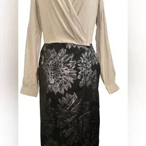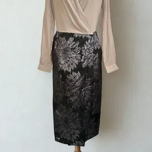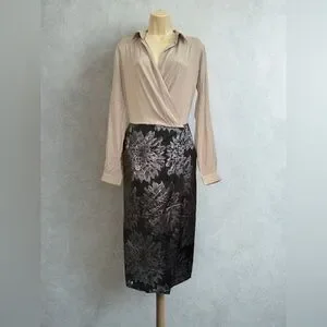 Long sleeve. Collared. Beige wrap top. Black pleated pencil skirt with silver floral design. Has pockets.