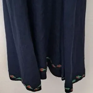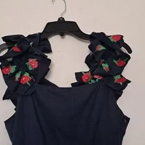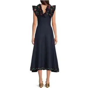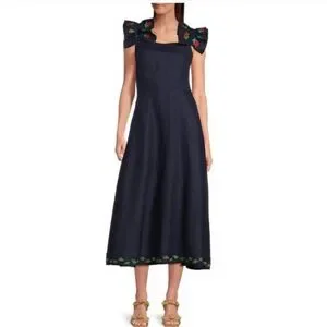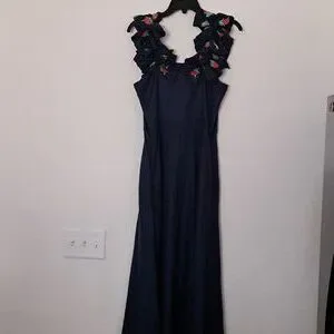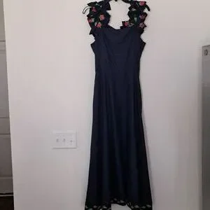 EUC Elegant blue midi dress by Fanm Mon. Features off-shoulder design with red floral accents. Perfect for special occasions.
