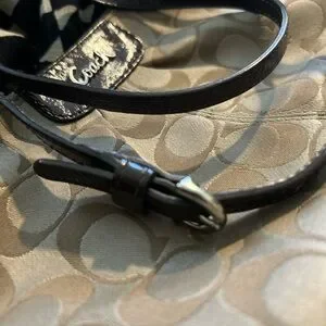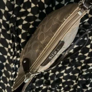 Stylish Coach crossbody with signature pattern. Features brown accents. Ideal for daily use.