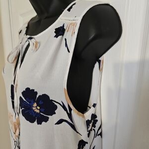Chic floral jumpsuit with button-down front. Features a stylish white and navy design. Perfect for casual outings.