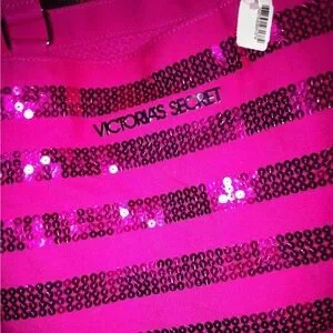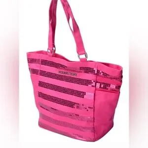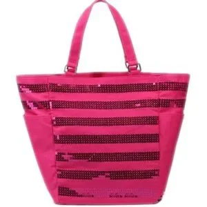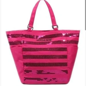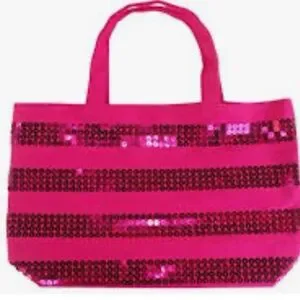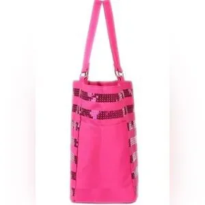 Victoria Secret Hot Pink Sequin Tote Canvas Striped Overnight Shoulder Bag New