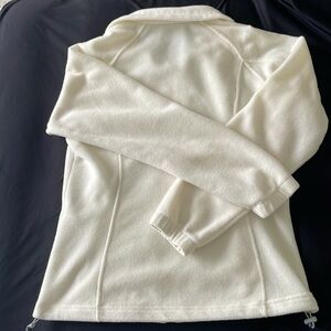 Soft and warm fleece jacket. Perfect for activities in the cold. Features a full zip front, two front zipper pockets, adjustable drawstring bottom, and a cozy fit. Excellent preowned condition. No stains, clean and odorless. Smoke and pet free home.