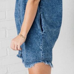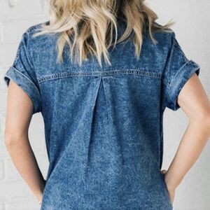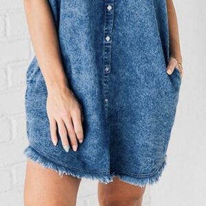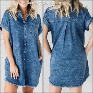 Distressed Denim Short Sleeve Button Front Pocket Blue Jean Cotton Mini Shirt Dress