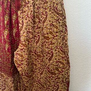 Colorful bohemian pants with paisley patterns. Features red and yellow tones.