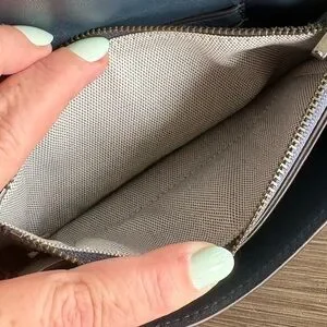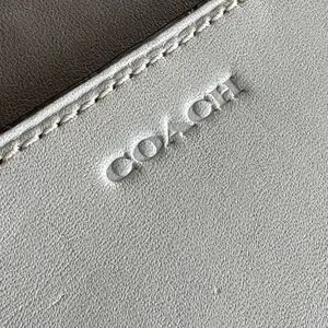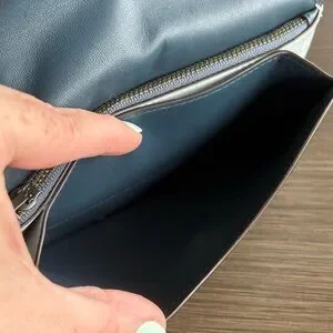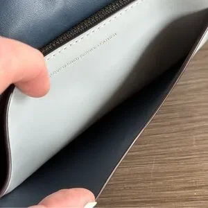 Coach 1941 collection clutch, blue and gray color block leather exterior, dark blue leather interior, gunmetal hardware, buckle wrist strap, special 1941 collection hang tag, collection no longer for sale, only available 2016-2020, EUC.