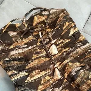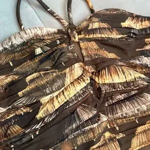 Brown graphic print (68% Tencel, 32% Cotton). Cocktail dress. Sleeveless. Halter neck. Back zipper closure.