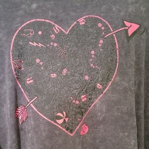 Torrid. Betsey Johnson. oversized, long, grey hoodie dress, featuring a pink heart design.