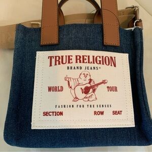 *NWT* True Religion Denim Mini Tote and Crossbody Strap. Dark Blue denim, brown tote handles, gold removable and adjustable crossbody strap, single compartment with snap closure, front pocket behind patch. New with tag, no flaws, see pictures for more details.