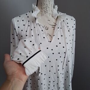 This is an adorable white and black polka dot Brownyn top from Boden. It has a split neck with ties and ruffle neckline and cuffs with gross rain trim. Size 8 US; 65% modal, 35% Polyester. Excellent condition.