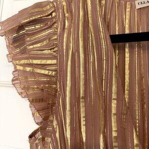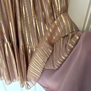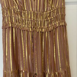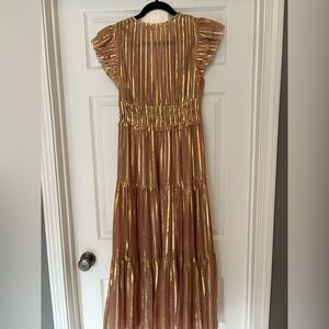 THE STRIPED SILK JUSTYNE DRESS IN ROSE BY ULLA JOHNSON. CRAFTED FROM A LOVELY ROSE COLORED SILK ADORNED WITH GOLD LUREX STRIPING. MAXI DRESS FEATURING LAYERED FLUTTER SLEEVES, DEEP V-NECKLINE, AND TIERED SKIRT. BEST COLOR REPRESENTATION ARE PICTURES TWO AND THREE. ORIGINALLY $645