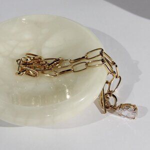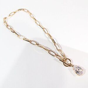 Gold-tone paperclip link necklace features a captivating clear crystal pendant that sparkles brilliantly in the light. Its unique design and luxurious finish make it a standout piece that adds a touch of sophistication to any outfit. The photos truly don't capture its beauty; you'll be mesmerized by the way it gleams with every movement.