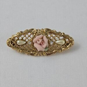 This petite, gold-toned pin features a delicate porcelain rose, accented with teardrop pearls for a touch of elegance.