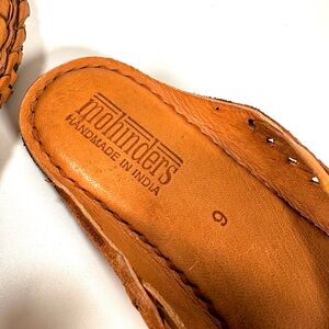 The image displays a Mohinders handwoven leather mule, specifically a slide-style sandal made with a distinct woven leather upper.