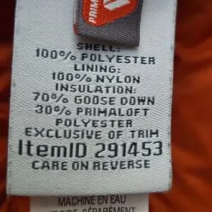Material: polyester shell, nylon lining, goose down & primalift insulation
