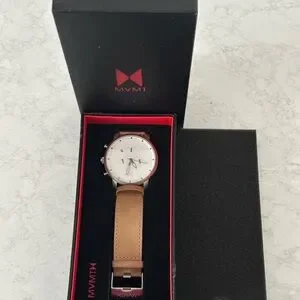Stylish MVMT watch with a sleek white face and tan leather band. Ideal for everyday wear.