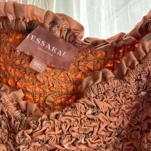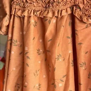 Peach brown dress with smocked front. Features puff sleeves and floral pattern.