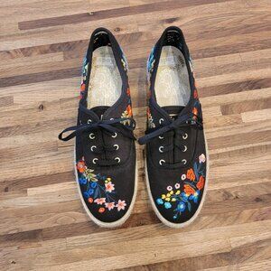 An espadrille platform and floral embroidery add earthy sophistication to a lace-up sneaker created in collaboration with Rifle Paper Co.