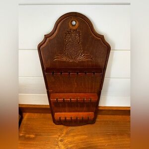 Elegant wooden wall rack with a carved pineapple design. Perfect for organizing small items.
